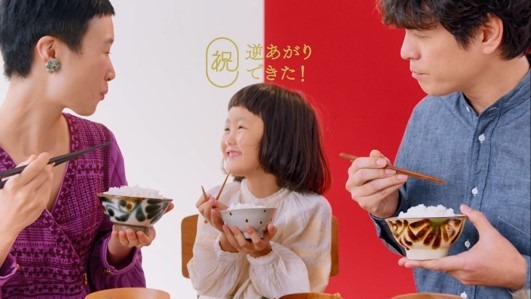 新潟米・新之助「大粒のしあわせ」篇では、「大粒のしあわせ」をキーメッセージに、「逆あがりできた!」、「仲直り!」、「孫に会える!」、「いい服買えた!」など日常の小さな幸せを、大粒の「新之助」で祝うさまざまな人々が登場します。