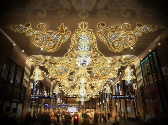 「BELLのCONCERTO」は、コンコースに浮かび上がる五線譜上に光のベルが鳴り響き、一歩進むたびに違う世界が目の前に広がっていくという、重厚であり幻想的なコンコースの空間をお楽しみいただけるイルミネーションとなっております。