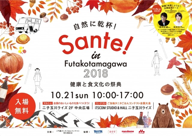 ご当地タニタごはんコンテスト実行委員会は、企業や自治体、農業生産者などが集い、農産物や飲食物等を販売したり、体組成計測や無料の健康相談などを行ったりする、「健康と食」をテーマにしたイベント「Sante! Futakotamagawa 2018(サンテ フタコタマガワ2018)」を、2018年10月21日(日)に東京・世田谷区の二子玉川ライズで開催します。また日本の食文化の継承や地域活性化などを目的に、2018年春より実施しているレシピコンテスト「ご当地タニタごはんコンテスト-ヘルシー郷土料理で健康まちおこし-」の全国大会も同時に開催します。本コンテストを盛り上げるため、タニタがサポートしている映画「体操しようよ」の公開(11月9日)を記念して、俳優の草刈正雄さんと木村文乃さんのトークショーも行います。