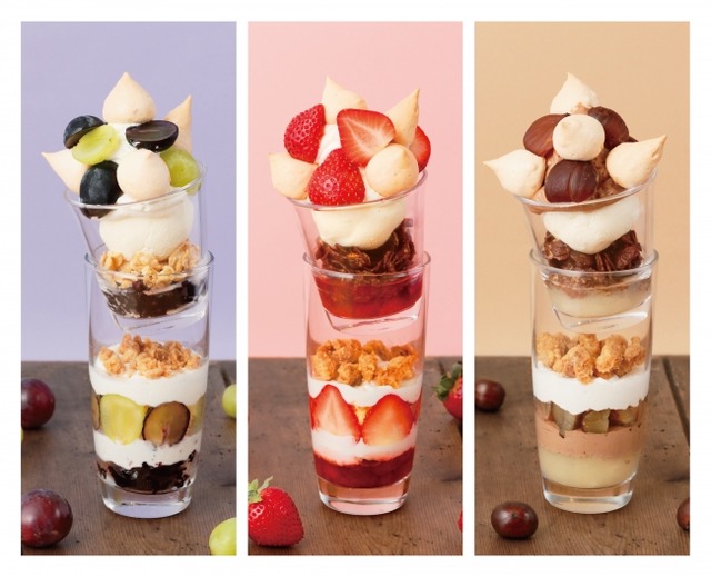 定番の果実「苺」に加えて、秋が旬の果物「ナガノパープルとシャインマスカット」、ほっくり甘い「栗」を贅沢に楽しめるメニュー構成です。秋の美味しさをぎゅっと詰め込んだ新感覚なパフェに仕上がりました。心地の良い秋の気候と共に、Wパフェで楽しいお茶の時間をお楽しみください。