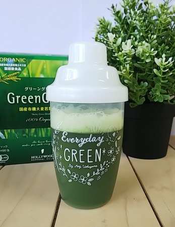 ハリウッド化粧品のオーガニック青汁「グリーングリーン」は大分県国東半島の豊かな自然の中で育てられた大麦のオーガニック認定青汁です。飲む直前に水や牛乳などと一緒にシェイクすると青汁の風味が口の中に広がりおすすめです。ハリウッド化粧品の国産オーガニック青汁「グリーングリーン」と水を入れてシェイクするとボタニカルなイラストが青汁の中に浮かび上がります。
