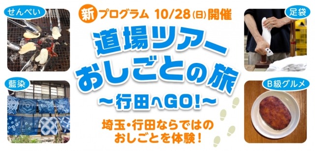 そんな行田の職業がまるごと体験できるのが、今回のプログラム『道場ツアー おしごとの旅 ~行田へGO!~」です。足袋(たび)、藍染(あいぞめ)、せんべい、ゼリーフライ(B級グルメ)と、行田の魅力がたっぷりつまったおしごと体験ツアーです。ぜひ、行田ならではの職業を体験してください。