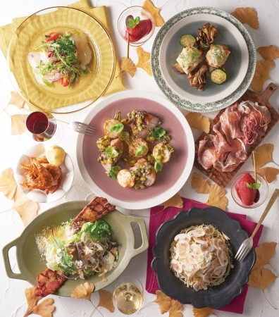 キハチ秘伝のミックススパイスがサクサクのフリットと相性のよい「甘海老のスパイスフリット」から始まり、旬を迎える歯ごたえのある食感が楽しめるホワイトマッシュルームとしらすを使い、実山椒で辛みをつけた「しらすと青実山椒のスパゲッティ ホワイトマッシュルーム掛け」、甘みが増す旬のかぶを使った「じっくりローストした豚ロース肉とかぶ 銀杏ラビゴットソース」などが楽しめます。今年は4 年に1 度行われるいちょうの樹の剪定前のため枝ぶりがよく、素晴らしい黄葉が期待されています。特等席での優雅な時間をお楽しみください。