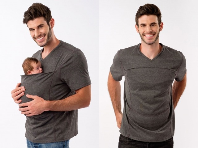 Dad Shirtは、カンガルーのように赤ちゃんを包みこめるポケットのついた男性用Tシャツです。赤ちゃんに安心感を与えるよう、お父さんと赤ちゃんが密着し、体温が伝わる設計になっています。