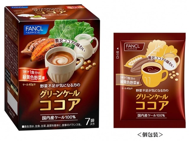 株式会社ファンケルは11月19日(月)から、「グリーンケールココア」(1箱7袋入り/価格:1,080円<税込>)を通信販売と直営店舗にて、数量限定で発売します。同製品は、野菜の王様「ケール」を原料とした青汁を温かく、おいしく召し上がっていただける製品です。毎年冬季限定で発売し、ご好評をいただいております。昨年販売した製品から、「カカオ」の量を10%増量し、糖類を10%抑えたことで、よりビターでコク深い大人の味わいに仕上げました。「ケール」と「カカオ」、「豆乳パウダー」の三つの素材で冬の時季の健康維持におすすめです。