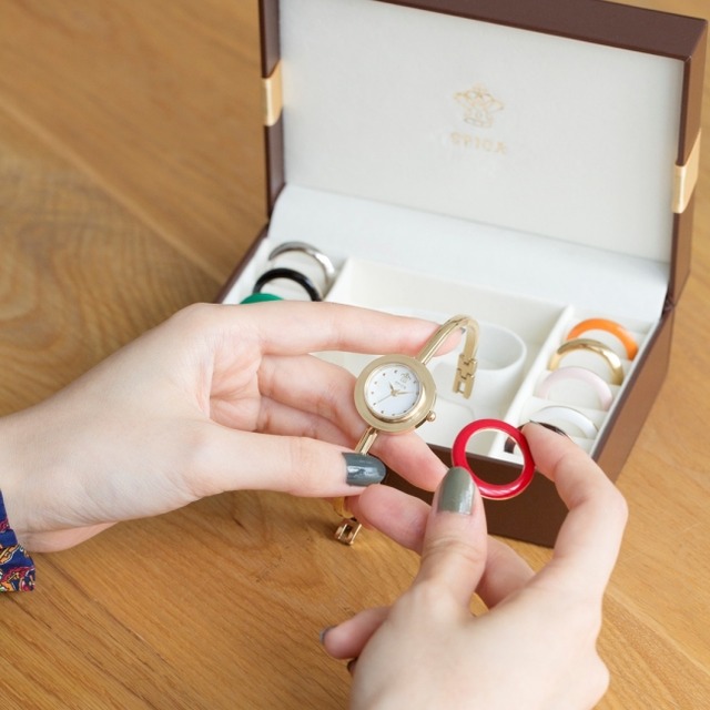 今回発売する限定モデルは、ベゼルリングを付け替えて楽しめるアクセサリー感覚のリストウォッチ。シンプルなデザインのバングルブレスレットタイプで、付属するベゼルリングは11色。専用スペシャルボックス付きでプレゼントにもおすすめです。