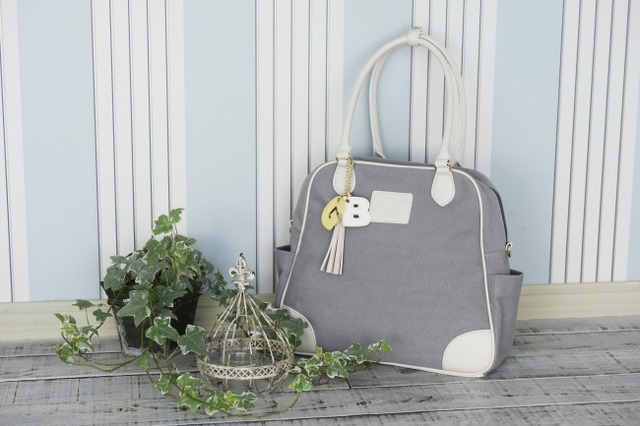 今回の新色は、通勤にも休日スタイルにも合わせやすい「グレー」。黄色のチャームをアクセントにして女性らしさをプラス、ちらっと見えるサーモンピンクの裏地がこだわりです。付属品として、おむつやおしりふきがたっぷり入り、肩がけや手持ちもできるおむつポーチもついています。