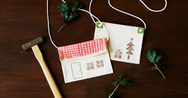 11月・12月はランドセルの革パーツや布を使って、「おうちポシェット」をつくります。トンカチを使って金具をつけたり、窓やドアのスタンプで飾り付けをしたりします。