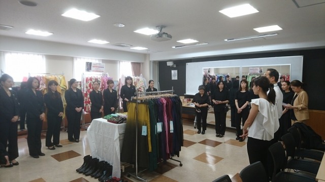 今回の展示会を開催するにあたり、事前授業において昨年同様にハクビ京都きもの学院から先生にお越しいただき、実際に袴を使って、試着、着付けを勉強し、お客さまに似合う着物や袴の色味の提案の方法や接客の仕方などを学びました。また、株式会社マイム様、株式会社曽我様、2社の協力のもと、校内で事前ミーティングを実施し、それぞれの企業の商品、袴のセットプラン内容について説明いただくとともに、袴の着付け方からアドバイスの仕方など第一線で活躍される方から接客方法なども学びました。