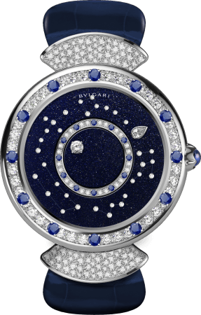 「ディーヴァ ドリーム」にローマの星空を想わせる詩的な2モデルが新たに加わります。2枚重ねのアベンチュリン製ディスクで時間と分を表示するデザインで、各ディスクに時間と分を指し示すダイヤモンドがあしらわれています。サファイアがブリリアントカット・ダイヤモンドと交互に配置され、アワーマーカーおよびミニッツマーカーの役割を果たしています。これらは神秘的なウォッチという偉大な伝統の系譜に属するクリエーションです。18Kピンクゴールドやホワイトゴールドで精巧に作られたウォッチが、多数のダイヤモンドを散りばめたアベンチュリンを背景に、詩的で神秘的なヴィジョンが時刻を告げます。