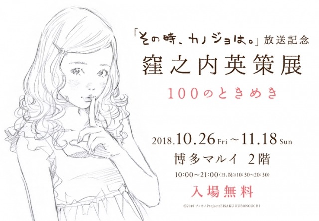 2018年10月26日(金)~11月18日(日)、博多マルイ 2F イベントスペースにて『「その時、カノジョは。」放送記念 窪之内英策展~100のときめき~』を開催します。会場では、窪之内英策氏が描く、胸がキュンとときめく100の作品を展示するほか、「その時、カノジョは。」の設定資料、貴重な原画など作品の魅力に迫る展示や、グッズの販売も行います。
