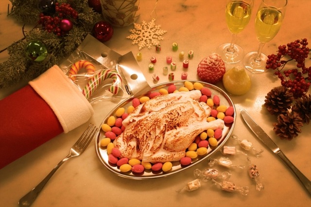 「お菓子の七面鳥」は、中にカラフルなチョコレートナッツが詰まったプレーン味のマシュマロです。60cmの「ビッグクリスマスブーツ」には、外がグミで中がマシュマロの「フルーツ型グミ」をはじめ、30個のお菓子をたっぶり詰めました。