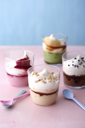 ミックスベリー、焦がしキャラメル、トリプルチョコレート、抹茶黒蜜の4 種。フレッシュなまま、コロンとしたかわいいカップにパッキング。おやつ時間やギャザリングにもぴったり!