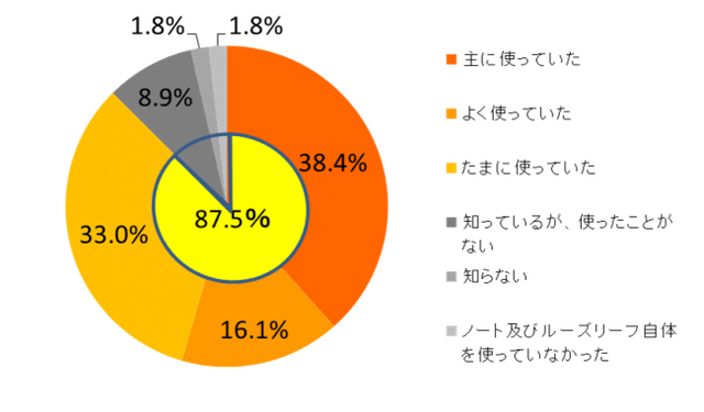 中学・高校時代にコクヨのドット入り罫線ノート及びルーズリーフを使っていたかを聞いたところ、実に87.5%が使用経験があることが分かりました。