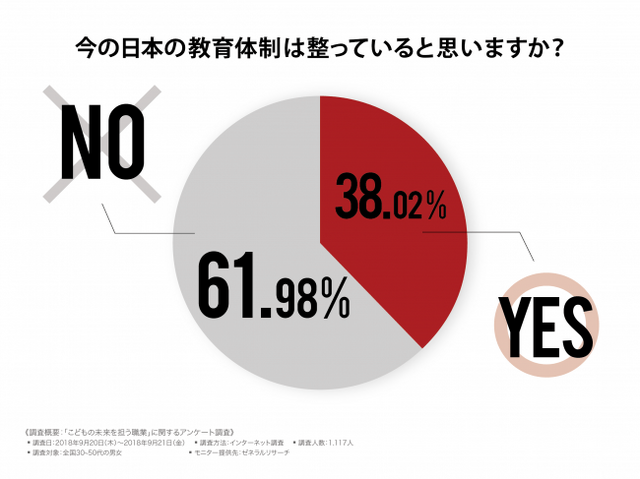 全国30~50代の男女に、「今の日本の教育体制は整っていると思いますか?」と質問したところ、なんと6割以上の方が「NO」と回答しました。