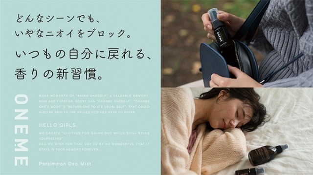 20代全般SNS世代から絶大な支持のあるレディスアパレルブランド「Kastane(カスタネ)」は、古来より消臭・抗菌に絶大な効果をもたらすと言われている「柿渋」一筋に京都山城地区で 130 年以上商品開発を されている、株式会社トミヤマと様々なシーンで使えるミストの開発に挑戦し、服にも・肌にも・髪にも使える新しいリフレッシュミスト「ONEME」を、2018 年 10 月 26 日サイバーエージェントグループの株式会社マクアケが運営する「Makuake」内で先行リリースします。