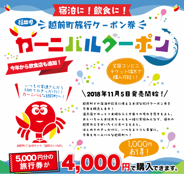 一般社団法人越前町観光連盟では、越前町内のお宿で使えるお得な旅行クーポン券「カーニバルクーポン」を全国大手コンビニエンスストアにて11月5日(月)より全国一斉販売いたします。