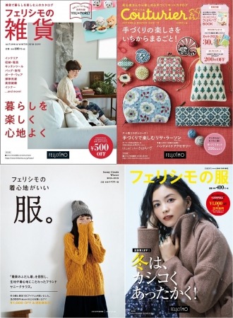 画像左から、『フェリシモの雑貨2018-'19年秋冬号』、『Couturier[クチュリエ] 2018-'19年秋冬号』、『フェリシモの着心地がいい服。 Sunny clouds[サニークラウズ] WINTER 2018-2019』、『フェリシモの服 2018-'19年冬号』