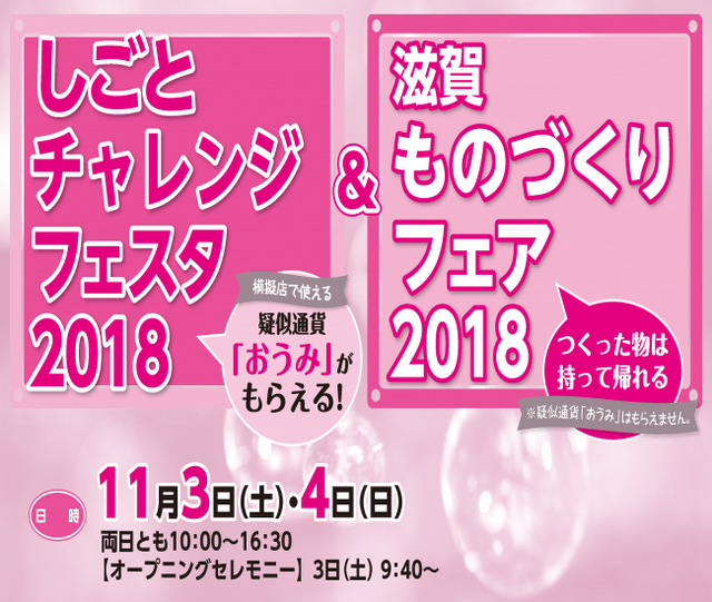 「しごとチャレンジフェスタ2018&滋賀ものづくりフェア2018」が、11月3日(土)、4日(日)10:00~16:30の両日、