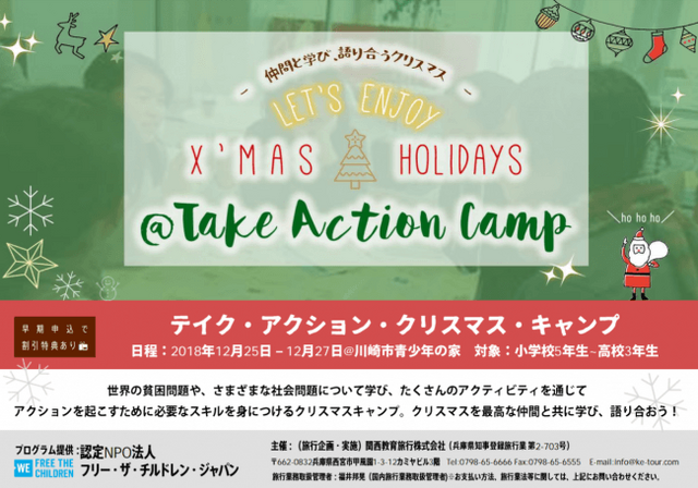 認定NPO法人フリー・ザ・チルドレン・ジャパン(東京都世田谷区南烏山6-6-5 3階 代表理事 中島早苗 tel 03-6321-8948)は小学5年生~高校生までを対象としたキャンプを、2018年12月25日(火)~27日(木)の2泊3日で開催します。