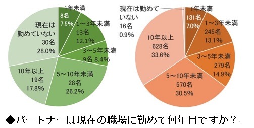 まず「パートナーは現在の職場に勤めて何年目ですか?」と尋ねたところ、男性の回答(妻の勤務年数)は「現在は勤めていない」が最も多く、次いで「5~10年未満」、「10年以上」となりました。女性の回答(夫の勤務年数)は、「10年以上」が最も多く、次いで「5~10年未満」、「3~5年未満」です。長くお勤めされている方が多いようです。
