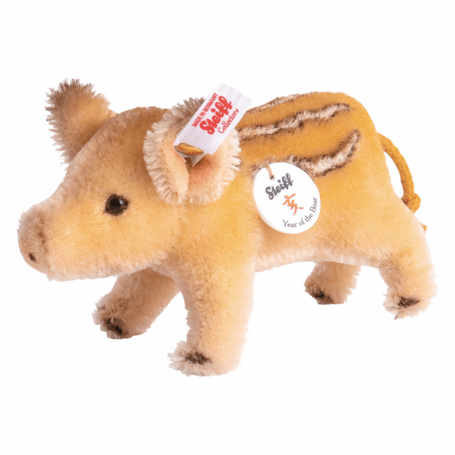 ふわふわモヘアのかわいい子供の亥「うりぼう」。ドイツの「シュタイフ」限定商品を表す白タグ付きです。玄関や出窓などにちょこんと置ける小型サイズで、縞模様を施した背中やしっぽのついたお尻など、どの角度から見てもキュート。干支に関わらず飾りたい可愛さのアイテムです。