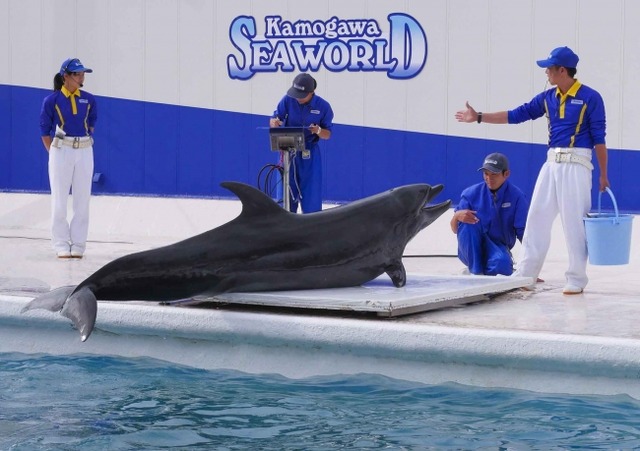 体重測定を行った動物は、セイウチ・フンボルトペンギン・バンドウイルカ・アカウミガメです。セイウチは、大きな体重計の上に、「ミナ」(11歳、メス)をゆっくりと誘導して計測し、体重は663kgでした。フンボルトペンギンはちょこちょこと動き回るため大きなカゴを用意し、その中に「チェチェ」(12歳、メス)を入れて計測し、体重は4kgでした。バンドウイルカは、ステージ上に設置された体重計に、トレーナーのサインで「メル」(推定35歳、メス)が自ら乗って計測し、体重は286kgでした。アカウミガメは、飼育員が4人がかりで体重計の上に乗せて計測し、体重は115kgでした。