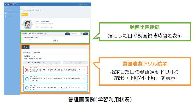 ■学習塾・学校向け機能:利用ユーザー(児童・生徒)の管理・学習状況把握機能(ユーザー情報・ログイン状況・動画視聴状況・動画視聴時間・正答数・各問題の内容・解答内容・正誤・所要時間など)