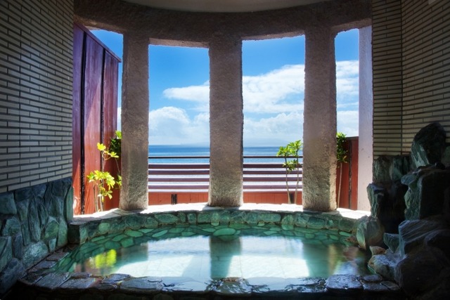 海と一体になれる海抜0メートルの絶景公共露天風呂。まるで海に入っているかのような臨場感が味わえます。朝6:30から入浴できるので、ここから眺める朝日も格別。宿泊のお客様は無料でご利用いただけます(フロントにて湯浴みセットお貸し出し)