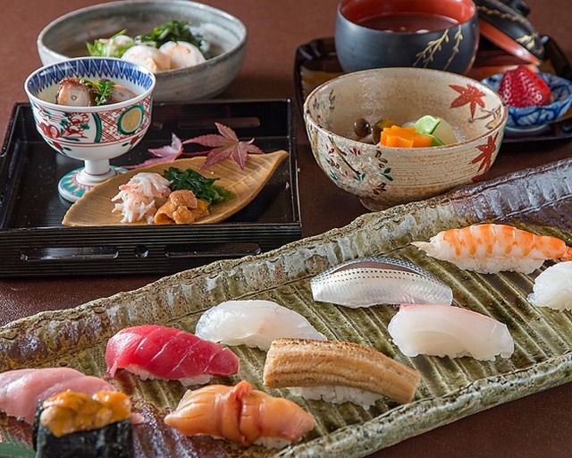 (天麩羅、お寿司、松茸など和食会席の魅力をお楽しみ頂けるコースとなります)