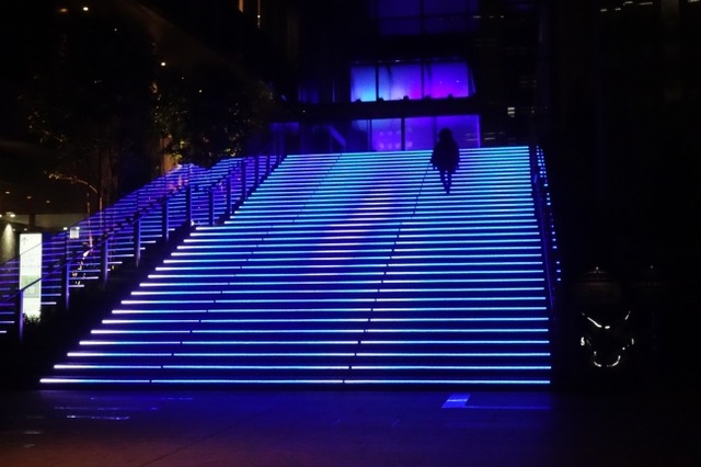 品川駅港南口から品川シーズンテラス方面へ向かうと、青をベースにした「光の大階段」が来場者を迎えます。1階から2階までの階段に施された躍動感のある煌めきと、10パターンもの迫力のある光の演出は来場者を惹き付けます。階段を上がり、アトリウムの空間を抜ければ、その先には昨年も多くの人気を集めた「カナール」。ハンドベルの音色によって、東京タワーへと伸びる光の道が約20パターンにも変化し、観る者を飽きさせない“動画映え”コンテンツとなっています。透き通ったベルの音と、色とりどりに変化する光との競演をお楽しみください。カナールから右手に広がるイベント広場には、一面に青い光が広がり、都会の真ん中にいることを忘れてしまうほどの静けさが来場者を包み込みます。広場の中の小高い丘は写真スポットとしても最適です。
