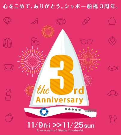JR総武線船橋駅に直結するショッピングセンター「シャポー船橋」は、11月に3周年を迎えます。お客さまへの感謝の気持ちを込めて、11月9日~25日の期間で3周年記念キャンペーンを開催いたします。キャンペーンのテーマは「新しい船出」。テーマに合わせた限定商品の販売や、様々なイベントを開催するほか、シャポー船橋でお買物をするとご応募いただけるプレゼントキャンペーンを実施いたします。