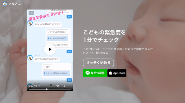 そこで、小児科医10数名に作成と監修をご協力いただき、「子どもの症状の緊急度と対処法」を1分のチャットでチェックするサービスを開発しました。 お子さんの体調が悪くなった際に、ぜひ使ってみてください。