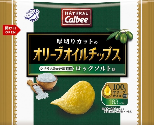 ●『オリーブオイルチップス ロックソルト味』は、シチリア産岩塩を100%使用しており、マイルドですっきりとした味を楽しんでいただけます。じわっと感じられる塩気がオリーブオイル独特の味わいを引き立てています。