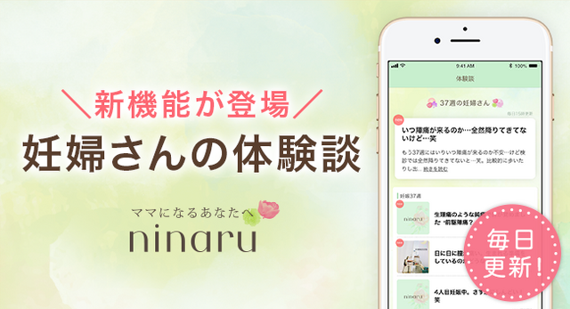 この「体験談」機能では、同じ週数の妊婦さんの体験談を読むことができます。毎日15時には新着の体験談をアップ!毎日新しい体験談に出会うことができます。Android版「ninaru」にも、今後「妊婦さんの体験談」機能を搭載予定です。