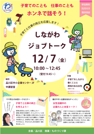 「しながわジョブトーク」は地域の企業とのざっくばらんな交流イベント。今回は、「子育てをしながら働くことに興味のある女性」を対象に開催されます。