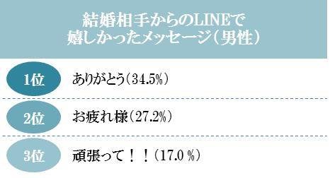 ◆結婚相手から来て嬉しかったLINEのメッセージ…男性「ありがとう」(34.5%)、女性「ありがとう」(42.0%)