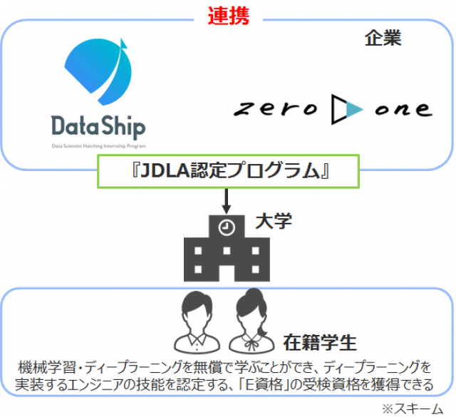 そこでこの度、「Data Ship」とzero to oneは、「E資格」の取得に必要な『JDLA認定プログラム』である、zero to oneのオンライン教材「機械学習」「ディープラーニング」の両コースを、学生向けに無償提供します。まずは、近畿大学、東京大学、東北大学の研究室協力のもと、機械学習やディープラーニングに関心の高い学生に対して広く両コースを提供し、若手先端IT人材の育成を目指します。