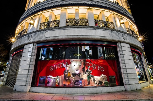 平成最後のクリスマスのウインドウディスプレイ「奏」は、シロクマをはじめ平成時代のウインドウディスプレイを彩ってきた個性的なキャラクターがバンド“Wako Heisei All Stars”を結成して再びお目見えする趣向です。