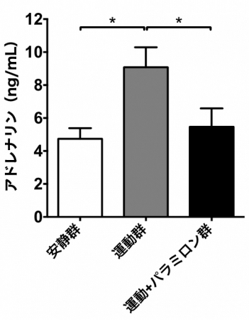 マウスを、1.通常食を与え、運動をさせない群(安静群)、2.通常食を与え、強度の高い運動※4をさせた群(運動群)、3.パラミロンを入れたエサを与え、強度の高い運動をさせた群(運動+パラミロン群)の3つに分け、2週間の経口摂取と強度の強い運動の実施を行い、それぞれにおいて血中のアドレナリン値を測定しました。