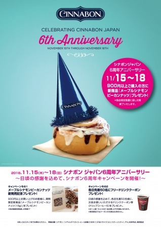 ブランドパートナーズ株式会社(本社:東京港区)が運営する、こだわりのシナモンロール専門店「Cinnabon/(以下:シナボン)」は、2018年11月15日日本再上陸6周年を迎えます。6周年を記念し、2018年11月15日に新商品『メープルシナモンピーカンナッツ』を期間限定新発売。シナボン各店では、日頃のご愛顧に感謝し、11月15日(木)~11月18日(日)の4 日間『6周年感謝フェア』を開催いたします。