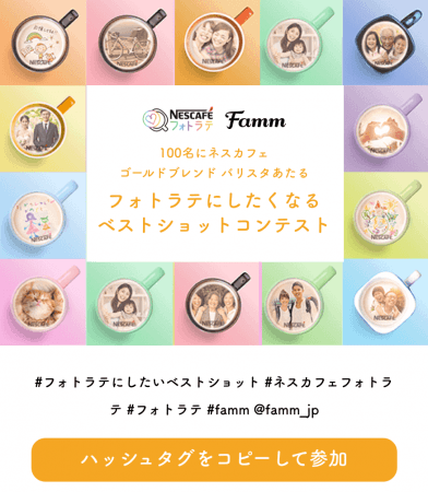 100万人の子育てママが利用する家族アルバムアプリ「Famm(ファム)」を運営する株式会社Timers(タイマーズ)(渋谷区 代表取締役社長:高橋才将)は、ネスレ日本株式会社(本社:神戸市、代表取締役 社長 兼 CEO 高岡 浩三、以下「ネスレ」)が提供する「ネスカフェ フォトラテ」とコラボレーションしたInstagram連動フォトコンテストを開始いたします。参加者は「フォトラテにしたい我が子のベストショット」に指定のハッシュタグをつけて投稿することでコンテストへ参加完了となり、素敵な写真を投稿した大賞受賞者100名に「ネスカフェ フォトラテ」体験セットを、優秀賞受賞者100名には写真を使ったフォトラテのデザインをプレゼントいたします。
