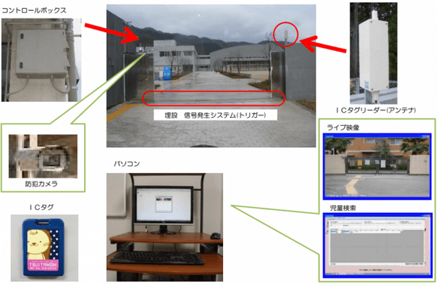 ICタグを持った児童が校門を通過したらその時刻を自動で記録。防犯カメラの映像と合わせて記録されます。