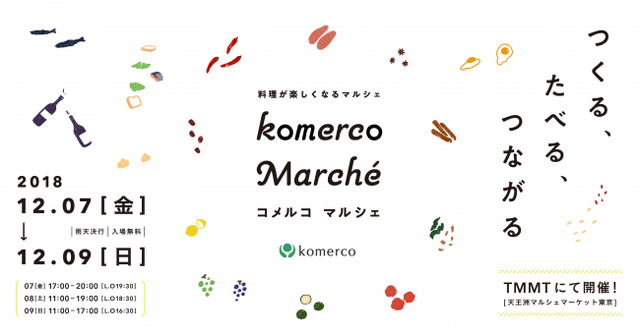 コメルコでは12月7日(金)より3日間「料理が楽しくなるマルシェ」と題して「つくる、たべる、つながる」をコンセプトにイベントを開催します。イベントでは食材を買うだけでなく、つくる、たべるといった体験を通して、今まで知らなかった新たな料理の楽しみ方を学んだり、素敵な“つくり手”と出会うことができます。昔ながらの製法にこだわった調味料、丁寧に育くんだ食材、手間ひまかけて仕上げたワインに日本酒など、毎日の料理が楽しみになるフードアイテムが登場します。