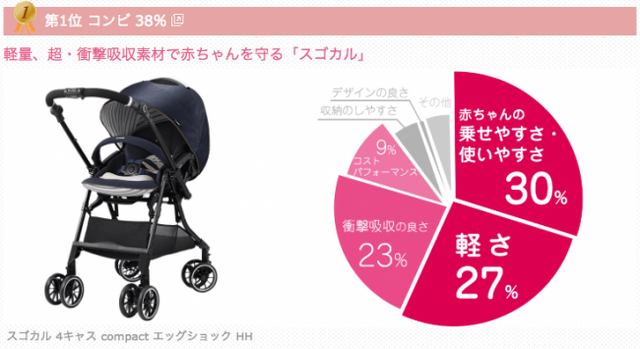 第2位は軽量、コンパクトなラクーナが人気のアップリカで、29%の支持を集めました。