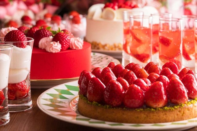 ■内容: いちご約6銘柄の食べ比べ、ケーキ約10種類、グラスデザート約5種類、シェフおすすめスープ、アンティパスト、パン・サラダなどの軽食、エノキアイス入りおかゆ、フリーフロー(スパークリングワイン・赤ワイン・白ワイン)、フリードリンク(コーヒー、紅茶、ハーブティー、アイスコーヒー、アイスティー、オレンジジュース、アップルジュース)