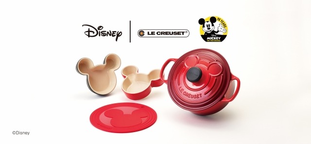 鋳物ホーローウェアからは、ミッキーのスクリーンデビュー90周年を記念して限定のお鍋「ミッキー 90周年デザイン シグニチャー ココット・ロンド 18cm チェリーレッド」が登場します。ミッキーマウスのアウトラインがフタに施されたスタイリッシュなデザインです。(限定パッケージ入り)期間限定デザインのシリコン製の鍋敷き「ミッキー トリベット チェリーレッド」と揃えてお使い頂けます。