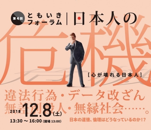 公益財団法人浄土宗ともいき財団(東京都港区、理事長:佐藤行雄、以下ともいき財団)は、12月8日(土)に第4回ともいきフォーラム「日本人の危機―心が壊れる日本人―」を開催します。宗教学者の山折哲雄氏、宗教社会学者の稲場圭信氏、読売新聞グループ本社最高顧問の老川祥一氏らを迎え、「日本人の道徳、倫理感」をテーマに講演とパネルトークを行います。
