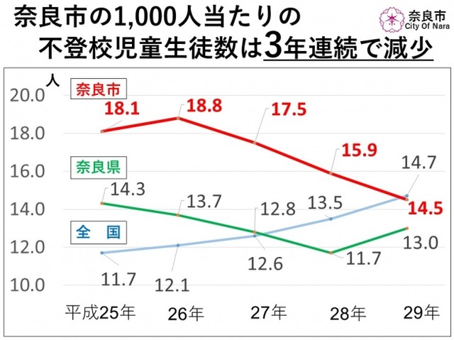 ・ここ数年間全国の割合を上回っていた奈良市の1,000人当たりの小中学生合わせた不登校児童生徒数は、平成29年度において全国の割合を下回っている。