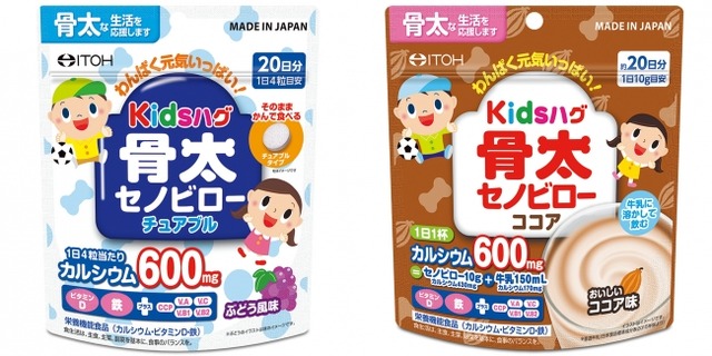 健康食品をはじめ医薬品、医薬部外品などを製造・販売する井藤漢方製薬株式会社(本社:大阪府東大阪市、代表取締役社長:井藤竜生)は、「カルシウム」を配合した、パウダータイプとチュアブルタイプの子供向け栄養サポートサプリメント、【キッズハグ 骨太セノビロー ココア】【キッズハグ 骨太セノビロー チュアブル】を、キッズハグシリーズの追加商品として2018年11月19日(月)より新発売いたしました。